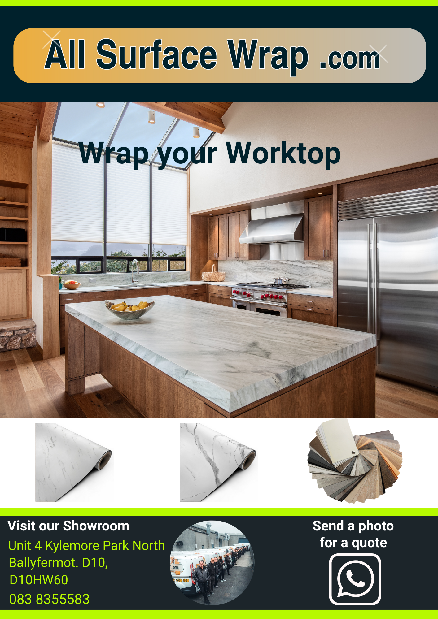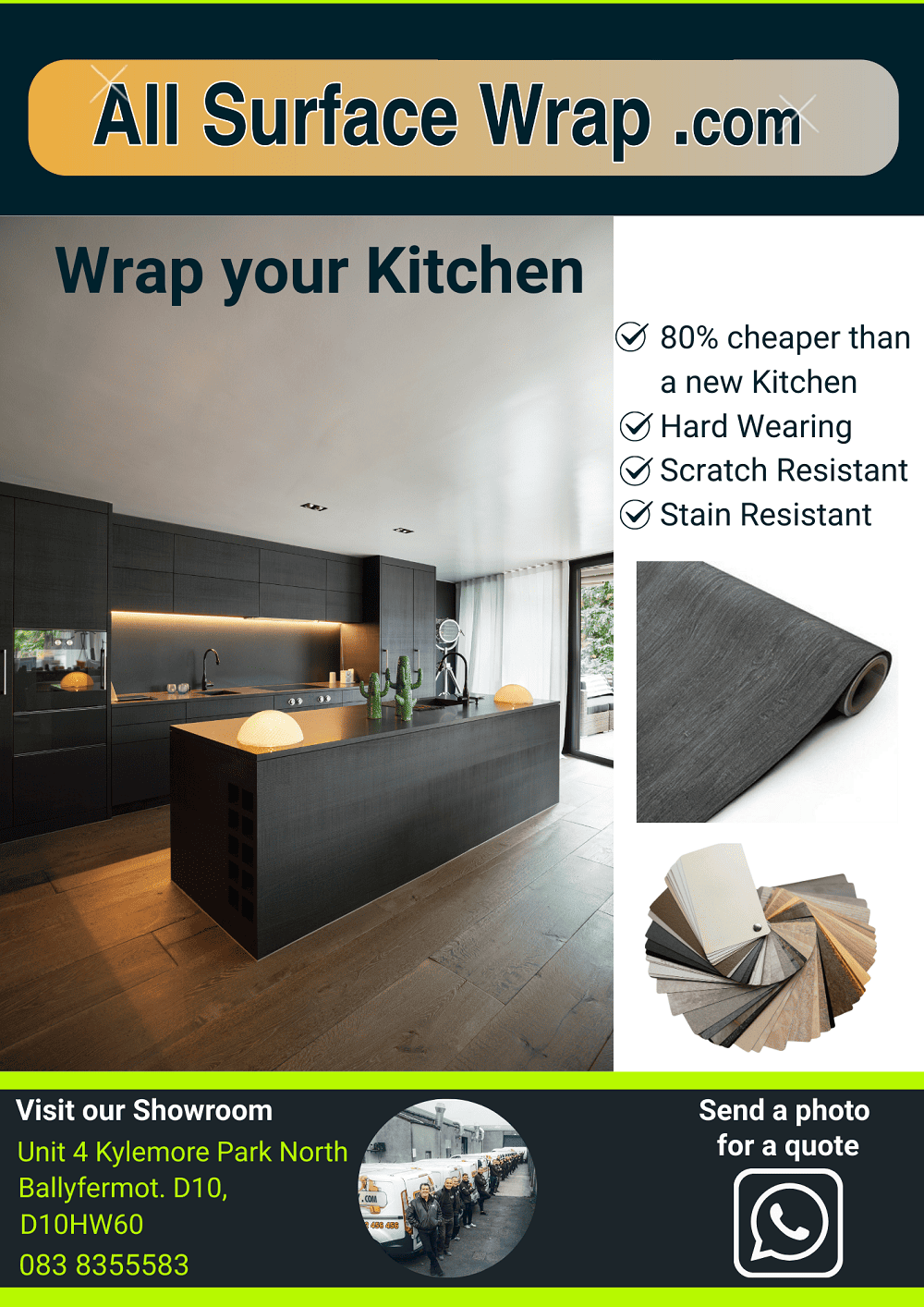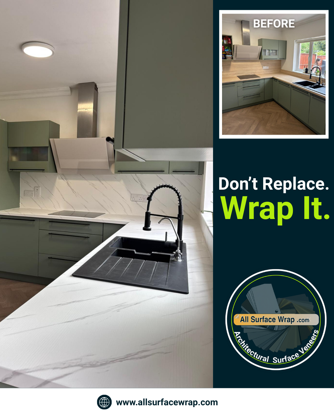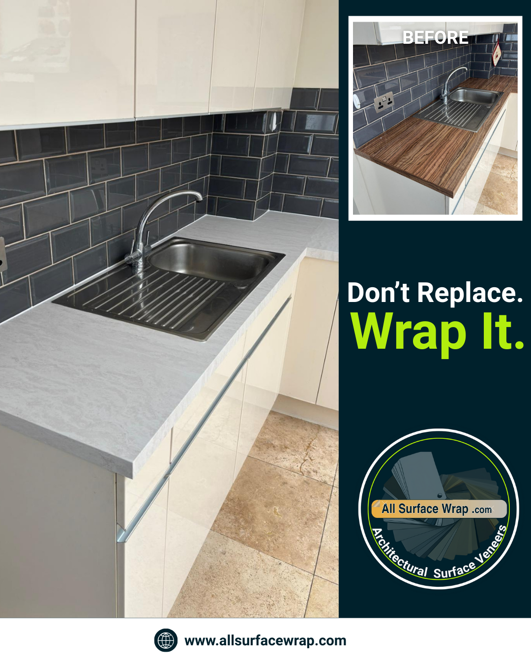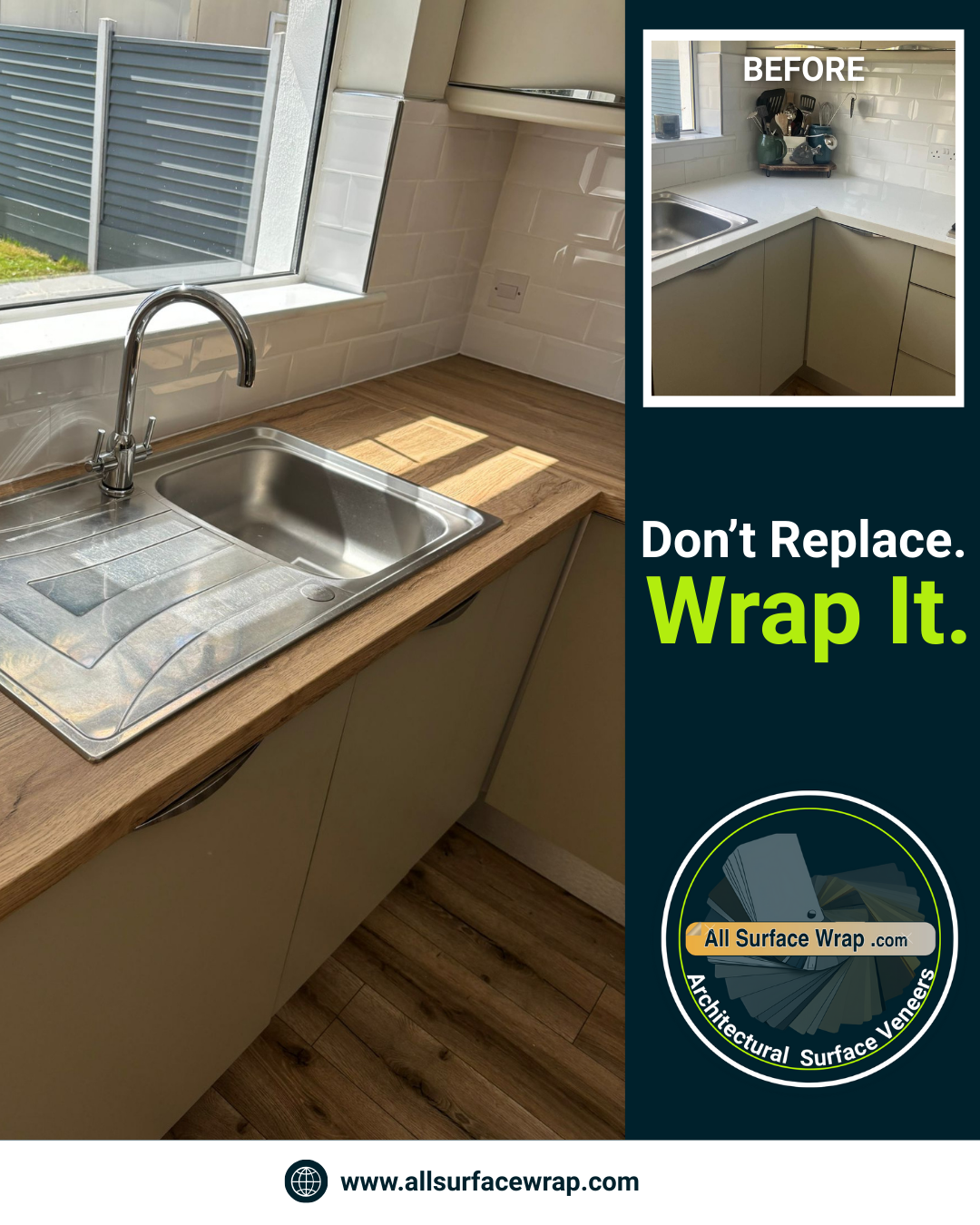 Our wraps are durable, waterproof, heat-resistant, and easy to maintain, giving you a high-end look without the high-end cost. Whether you want a sleek modern surface or a warm natural feel, wrapping is a fast and affordable way to upgrade your kitchen.